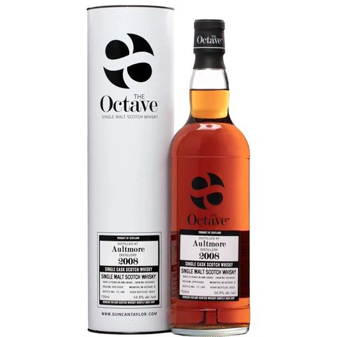 This whisky is part of Duncan Taylor's 'Octave' collection. It was distilled at Aultmore in Speyside and aged for fourteen years from 2008 to 2023. It gains a distinct oaky flavour from being finished in an octave cask. Only 81 bottles are available.
