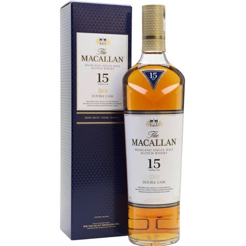 The Macallan Double Cask 15 Years Old is a balanced single malt whisky created by bringing the perfect harmony of two oaks into one exceptional single malt whisky. Sherry seasoned American oak adds delicate vanilla to the subtle spice of European oak, delivering a whisky with a sweeter, warmer taste and character. Two distinct oaks create the perfect harmony within one exceptional single malt whisky. Our Double Cask whiskies are aged in two types of oak, in specially selected hand-crafted casks seasoned with dry Oloroso sherry. American oak imparts delicate flavours of vanilla, citrus and butterscotch. European oak delivers the unmistakable subtle spice of The Macallan. Once matured after 15 years, these two exceptional whiskies unite to create a distinctive single malt with a sweeter, warmer taste and character. Enjoy it neat, over ice or in a serve.