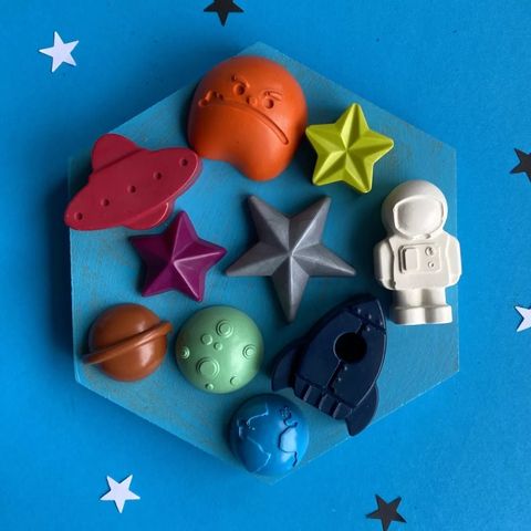 A beautiful gift tub FULL of space themed shaped wax crayons in a selection of colours.