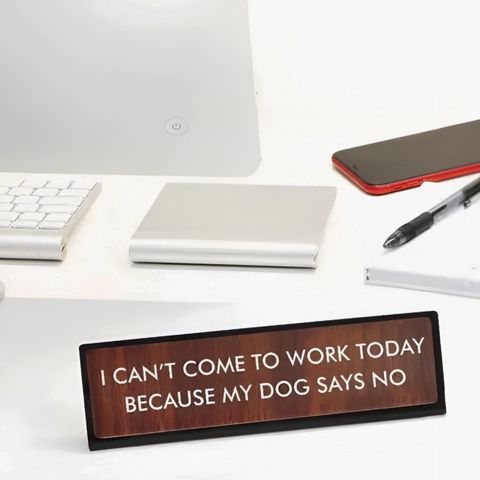 Product Name: I Can't Come to Work Today Because My Dog Says No Desk Plaques Liven up your workspace with these awesome desk plates. Make a statement to colleagues or simply give yourself a dose of daily motivation. They're also the perfect gift for hard-to-buy-for co-workers! "I can't come to work today because my dog says no" engraved on a wooden plate with a black acrylic border. Available in two sizes: medium and large. Medium measurements: L15 cm x H4 cm Large measurements: L21 cm x H6 cm