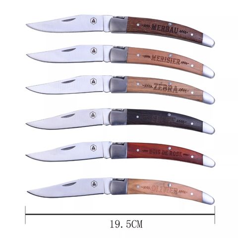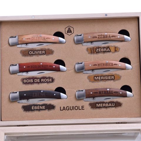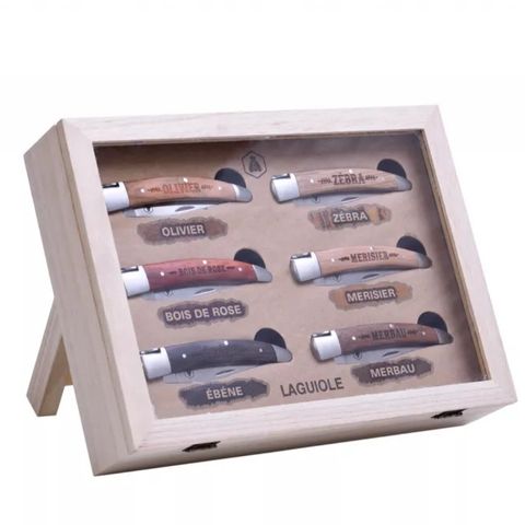 Collection box of 6 folding knives assortment of 4 different wood species Delivered in a Wood and Plexi Showcase Display - Ideal for Gift