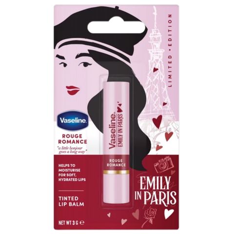 Vaseline Emily in Paris Tinted Lip Balm Limited Edition 3 g - Colour: Rouge Romance perfectly combines Parisian elegance and hydration.Diisostearyl Malate, Pentaerythrityl Tetraisostearate, Petrolatum, Trimethylolpropane Triisostearate, Octyldodecanol, Triisostearyl Citrate, Microcrystalline Wax, Synthetic Wax, Isononyl Isononanoate, Ozokerite, Bis-Diglyceryl Polyacyladipate-2, Euphorbia Cerifera Cera, Butyrospermum Parkii Butter, Ceresin, Jojoba Esters, Parfum, Bht, Bisabolol, Tocopheryl Acetate, Aqua, Glycerin, Tocopherol, Phenoxyethanol, Honey Extract, Alpha-Terpinene, Benzaldehyde, Benzyl Alcohol, Benzyl Benzoate, Benzyl Salicylate, Beta Caryophyllene, Citral, Eugenol, Geranyl Acetate, Limonene, Linalool, Linalyl Acetate, Pinene, Rose Ketones, Terpineol, Terpinolene, Vanillin, Citrus Aurantium Bergamia Peel Oil, Ci 45410, Ci 77891, Ci 77491, Ci 19140, Ci 42090, Ci 15850"