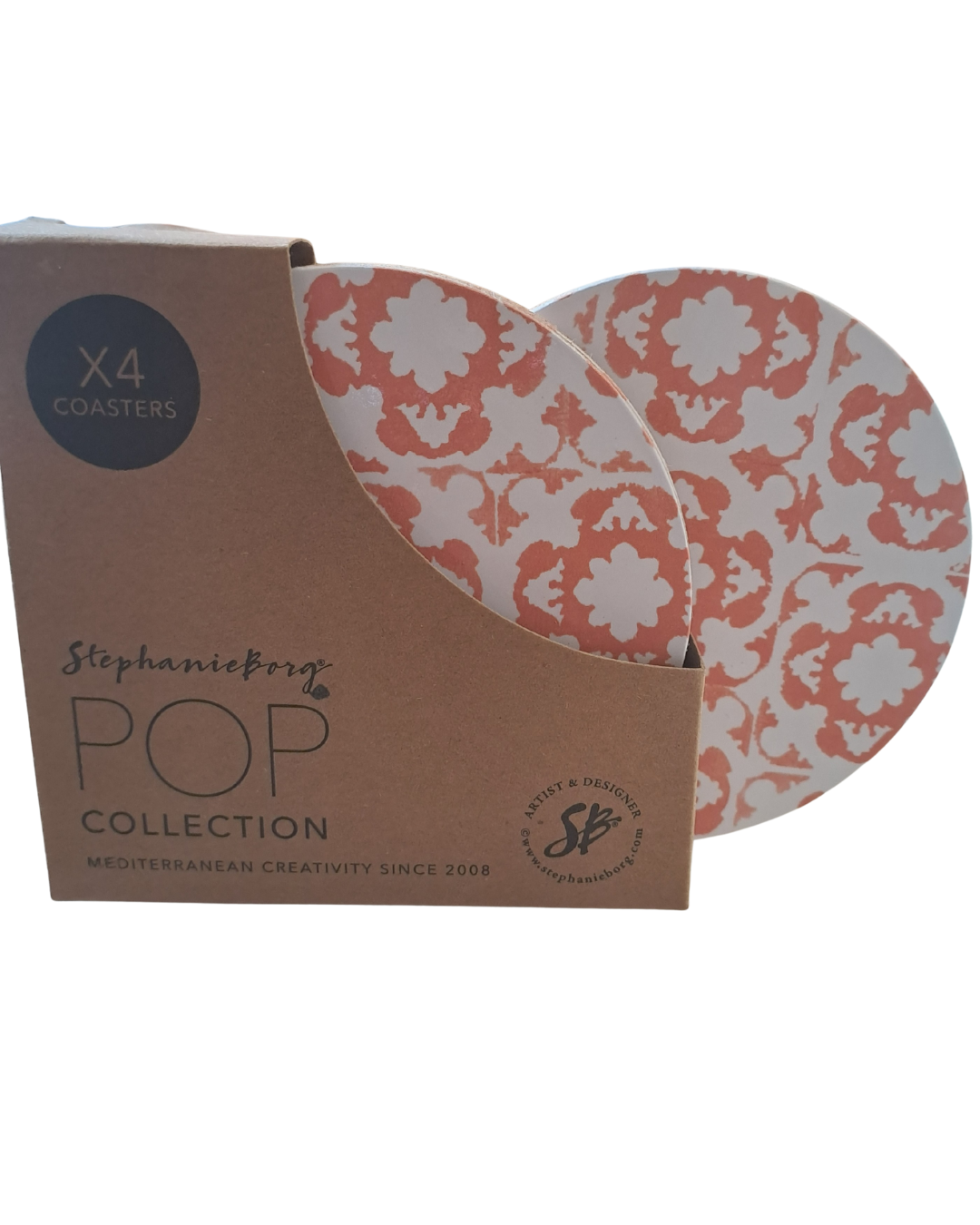 The POP collection was created in 2013 as a playful tribute to malta's traditional cement tile. Twelve years on it Gets Fresh Twist inspired by artisanal tile_ making we used stencilling to reflect its handmade charm and the beauty in perfection fair distinctive hues SUNSET,BREEZE,BEACH AND GARDEN, captured the spirit of Mediterranean living in every shade * 4 cork based coaster