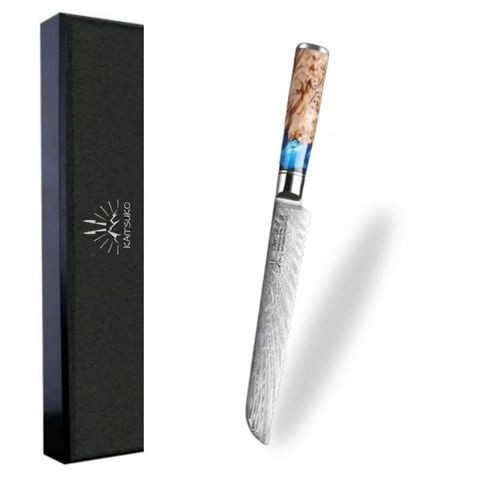 Discover our bread knife - Chef Tanaka Yellow Sea Series. Made from Damascus steel, these kind of bread knife, are the strongest and most durable on the market. The original handle, worked and covered with resin, gives them an elegant and deep style. This knife is unique thanks to the designs on the handles and blades.