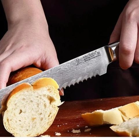 The solid handle will allow you to easily grip your knife for perfect control of your movements when cutting, for example. The bread knife, thanks to its serrated blade, allows you to easily slice all types of bread, whether it has a hard or thick crust. It is also ideal for cutting pizzas, brioches, sponge cakes and bruschetta’s without crushing or tearing them. Bread knife Blade material: 90Cr18MoV Damascus steel - 67 layers Handle material: Stabilized wood + epoxy resin Steel hardness
