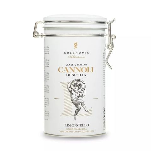 The icon of Sicilian pastries. Delicious cannoli with a delicate limoncello cream filling in a charming swing top jar. Net weight 200g List of ingredients Baked dough rolls with creamy limoncello filling Ingredients: wheat flour, powdered sugar, margarine, wine (sulphites), eggs, cocoa, salt, sugar, vegetable oils (sunflower, palm), 0.7% limoncello, milk, cocoa butter, glucose syrup, maltodextrin, emulsifier : Lecithin (soy), skimmed milk powder, natural lemon flavor. May contain traces of nuts, gluten, milk and soy. Made in Italy.