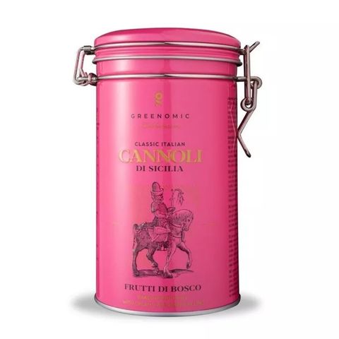 The icon of Sicilian pastries. Delicious cannoli with a delicate wild berry cream filling in a charming swing top jar. Net weight 200g List of ingredients Pastry rolls (wheat flour, icing sugar, margarine, wine, eggs, cocoa, salt) cream filling (30%) [sugar, vegetable oils (sunflower, coconut, palm), wild berry paste (2.5%), (glucose syrup, berries (15%) (blueberries, raspberries, strawberries), acid (citric acid), coloring: elderberry extract], milk, cocoa butter, maltodextrin, emulsifier: lecithin (soy), flavorings. May contain traces of nuts, gluten, milk and soy. Made in Italy.