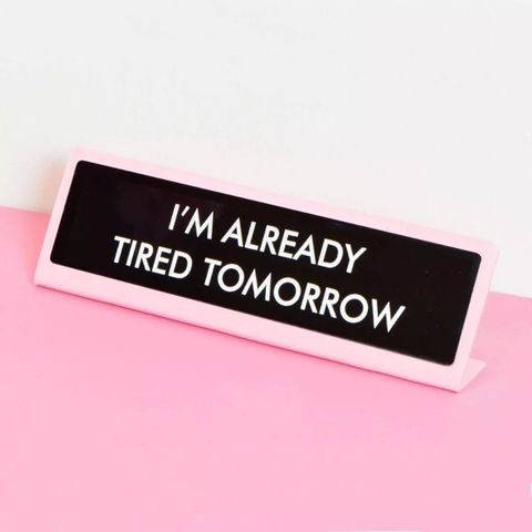 Sass up your workspace with these amazing deskplates. Make a statement to colleagues or just give yourself a dose of everyday motivation. They make the perfect gift for hard-to-buy for workmates too! 'I'm already tired tomorrow' engraved onto a black plate with baby pink acrylic surround.