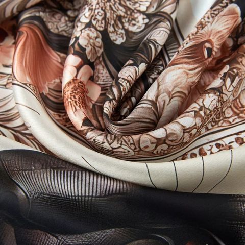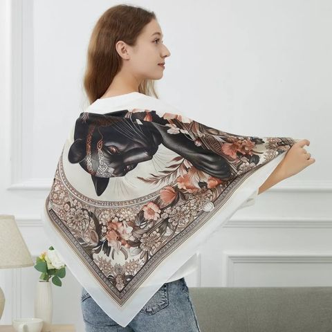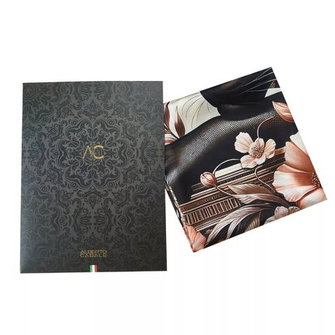 Dive into a world of mystery and elegance with the “Mystère Florale” scarf. This silk masterpiece features a sumptuous black panther, a symbol of strength and mystery, surrounded by delicate flowers and lush foliage. The contrast between the vigor of the feline and the softness of the pink flowers creates a captivating visual harmony, perfect for those who wish to express both their inner strength and their aesthetic sensitivity. Made from 100% silk, this scarf from the Alberto Cabale brand measures 90x90cm,