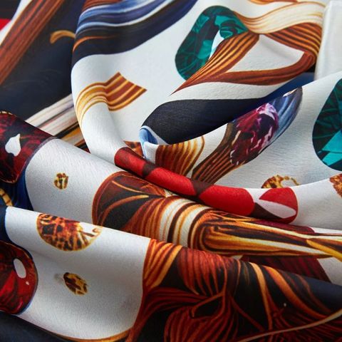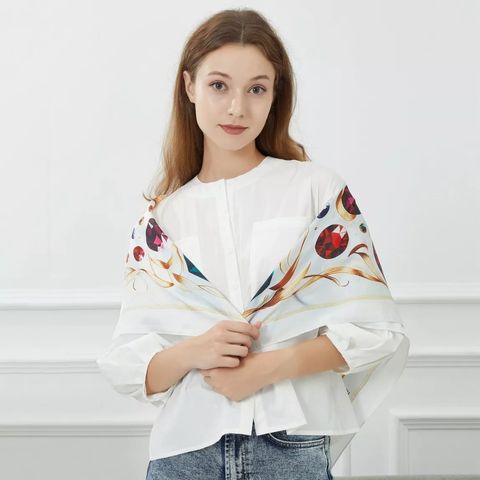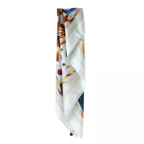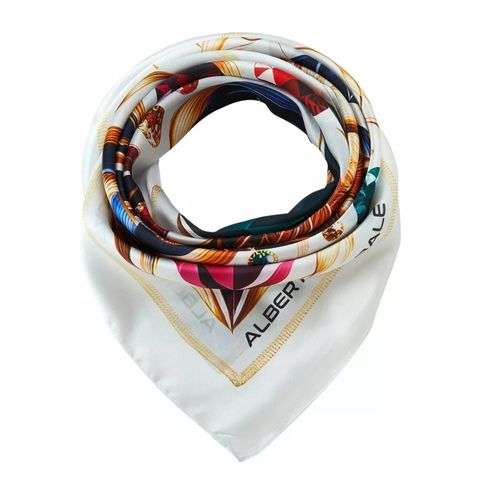 The "Metal Panther" scarf illustrates a stylized panther surrounded by sparkling jewels, reflecting bold luxury and timeless strength. Made from 100% silk, this large 90x90cm square combines elegance and sophistication. The precision of the details in the gemstone patterns and metallic flashes on a white background highlights the expertise of Alberto Cabale. This piece is a true tribute to wild beauty and opulence. Summary: Size: 90x90 cm Material: 100% silk
