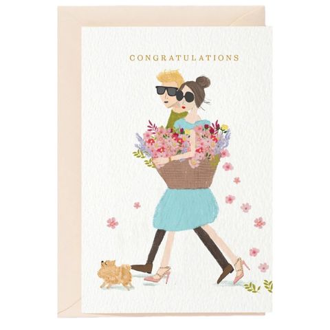 Looking for an original and stylish greeting card for your best friend who has just achieved something great? Then this handmade card by Nelly Castro is just the thing for you! The card shows a happy couple with their dog enjoying spring and giving flowers. With the words "Congratulations" you can congratulate your friend on her success and show her how proud you are of her. The card is made of high-quality paper and measures 10.5 x 14.8 cm. It goes perfectly with a bouquet of flowers or any other gift