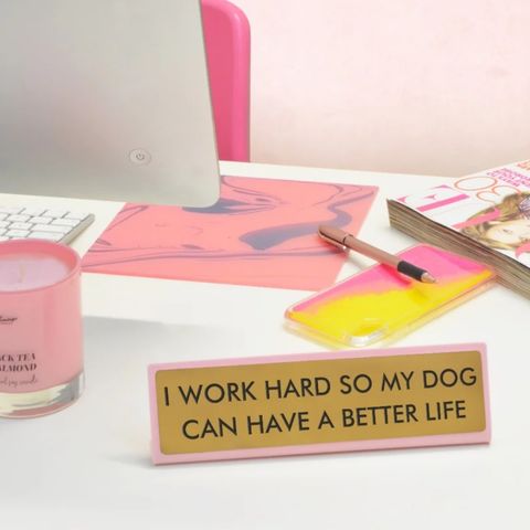 'I Work Hard so my Dog Can Have a Better Life' engraved onto a gold plate with baby pink acrylic surround.