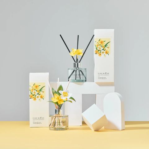Cocodor Daffodil Diffuser 200ml - White Musk Fragrance with Daffodil flower stick and Eucalyptus leaf stick + 5 reed sticks Fill your space with the timeless elegance of White Musk with the Cocodor Daffodil Diffuser 200ml. This luxury reed diffuser combines a rich, powdery musk base with delicate floral and woody notes, creating a soft, captivating aroma that fills any room with warmth and sophistication. Complemented with two life-like colorful daffodil flowers, this diffuser adds a touch of freshness to your space while providing long-lasting fragrance diffusion. Five ivory reed sticks ensure an even, continuous release of scent, ideal for creating a calming atmosphere in your living room, bedroom, office, or spa. Perfect for those seeking both style and a soothing, inviting fragrance, the Cocodor Daffodil Diffuser transforms any room into a serene spring retreat.