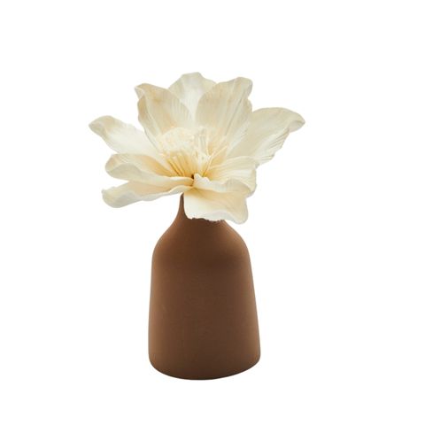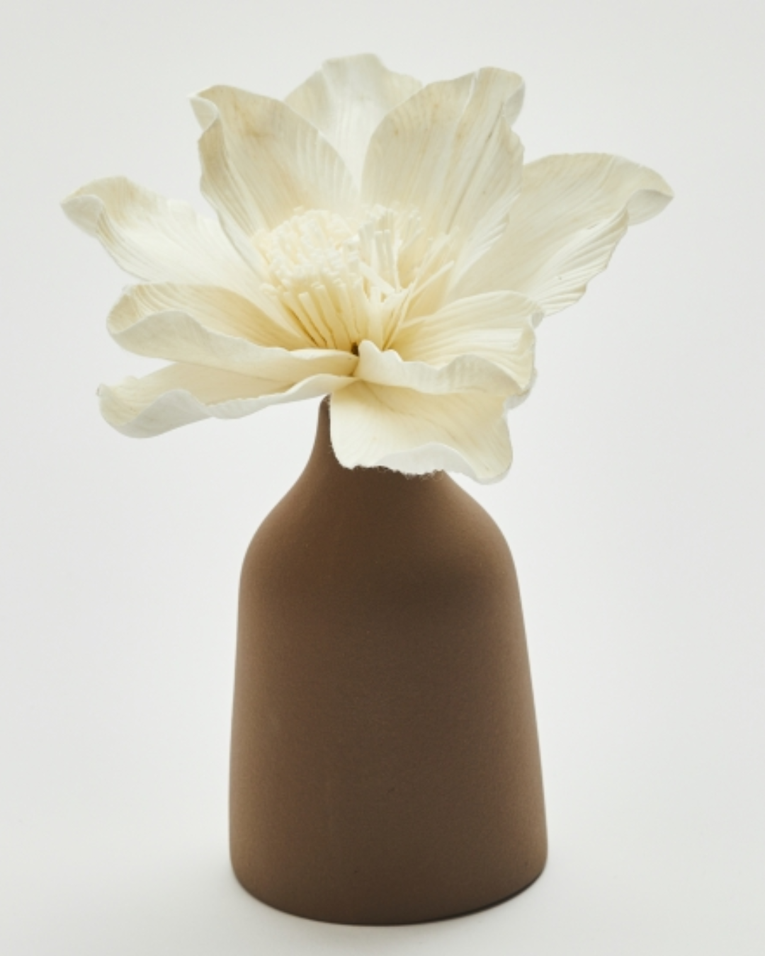 MANA CHOCO is a diffuser vase with a sola flower connected to a cotton wick that absorbs fragrance once it's contained in its vase-shaped reservoir. Made entirely from ceramics, this diffuser reflects the elegance of fine craftsmanship and the high-end appeal of sustainable, eco-friendly materials. It's a vase with an irregular design that embraces the era of trends, bringing movement and a touch of boldness to the home. It's suitable for blending into the decor, whether with raw wood, plants, bright or pastel colors, or contemporary or modern stylling. The choice is yours !