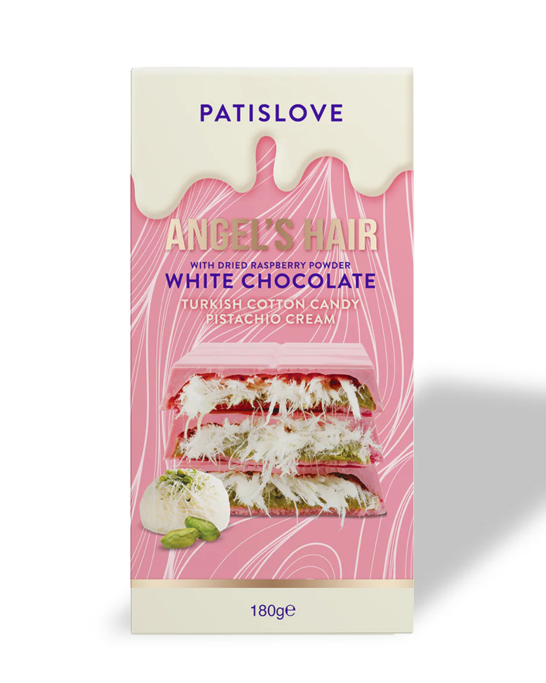 Elevate your chocolate experience with Angel’s Hair White Chocolate with Dried Raspberry Powder. This luxurious bar blends creamy white chocolate with vibrant raspberry essence, layered over fluffy Turkish cotton candy and rich pistachio cream. The dried raspberry powder adds a tangy twist that perfectly balances the sweetness and nuttiness. A handcrafted delight that fuses texture, flavor, and visual appeal into every bite — indulgence meets artistry.