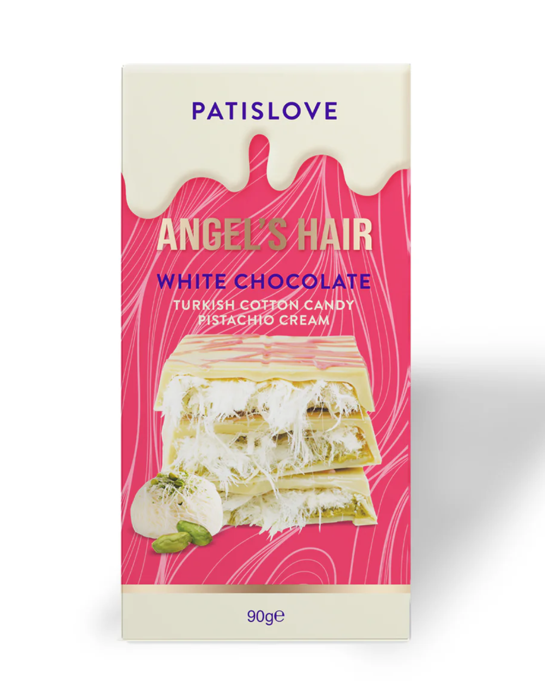 Experience the soft elegance of Angel’s Hair White Chocolate — a premium blend of creamy white chocolate filled with delicate Turkish cotton candy and smooth pistachio cream. The airy strands of cotton candy create a melt-in-your-mouth sensation, while the nutty richness of pistachio balances each bite. Crafted for those who appreciate layered textures and Mediterranean-inspired flavors, this treat is a uniquely luxurious chocolate experience.