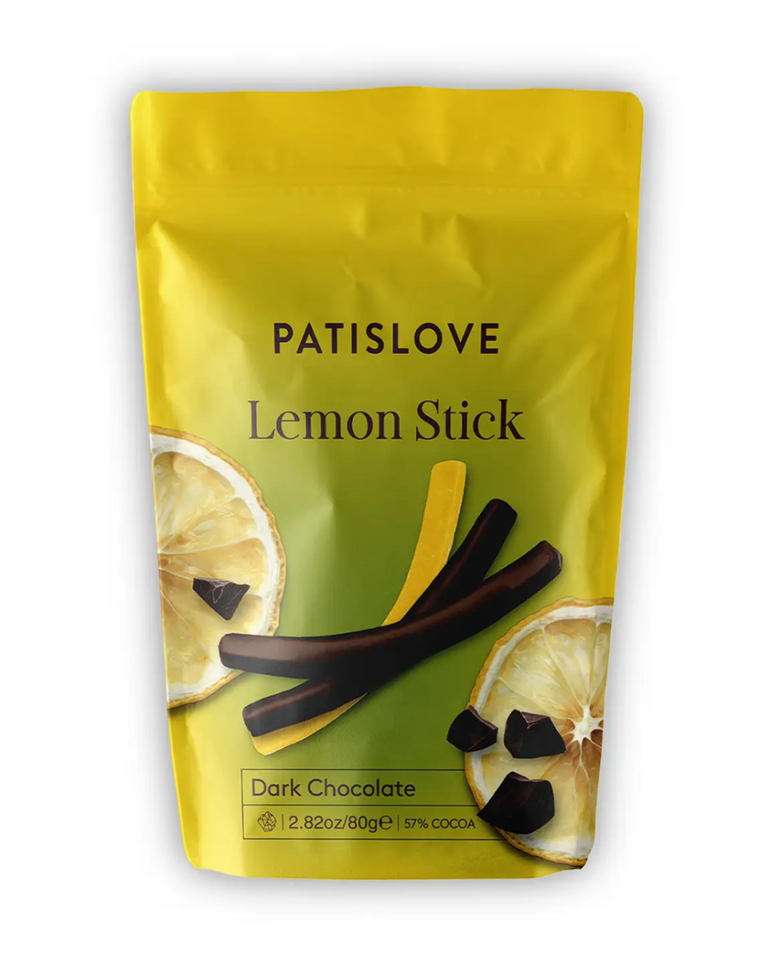 Patislove Lemon Stick is a bold twist on indulgence—zesty lemon infused with rich, 57% dark Swiss chocolate. Each stick delivers a crisp, refreshing citrus note wrapped in smooth, decadent cocoa, striking a balance between sharp and sweet. Made without preservatives or added colorants, it's a clean, honest treat with just the right edge. Whether paired with coffee, wine, or enjoyed on its own, this snack offers an elevated flavor experience in a resealable pouch—perfect for gifting, sharing, or savoring on the go. Contains real lemon and premium dark chocolate for a naturally vibrant taste. Discover a citrusy delight crafted for those who crave something distinctive.