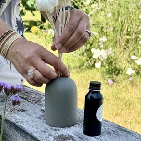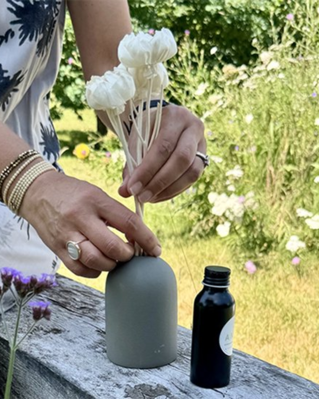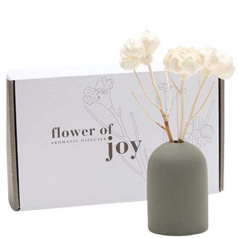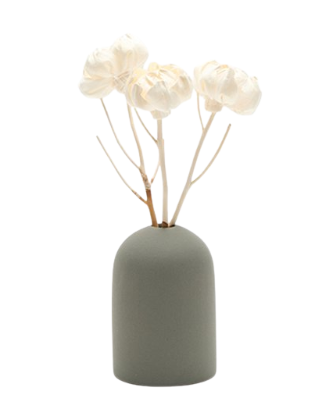 Fidji Khaki: Elegant Ceramic Diffuser with Sola Flowers Discover the Fidji Kaki by Anoq, a unique and stylish ceramic diffuser that will change the way you fragrance your home. Instead of traditional reed diffusers, this diffuser uses beautifully handcrafted sola flowers . These natural, decorative flowers are more than just eye-catching; they're the key to a wonderfully scented home. The stems of the sola flowers absorb the fragrance of your home, which is then subtly and evenly diffused throughout the room by the flower's delicate petals. This creates a consistent yet gentle fragrance experience that lasts all day. The sleek, minimalist khaki ceramic vase forms the perfect base and adds a warm touch to any interior.