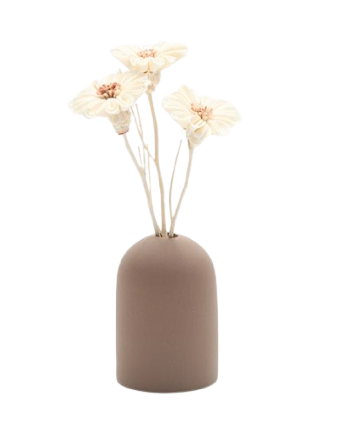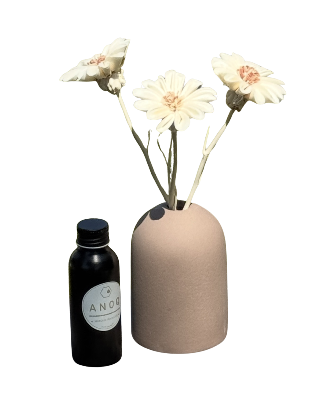 Discover the Fidji Choco by Anoq, a unique and stylish ceramic diffuser that will change the way you fragrance your home. Instead of traditional reed diffusers, this diffuser uses beautifully handcrafted sola flowers . These natural, decorative flowers are more than just eye-catching; they're the key to a wonderfully scented home. The stems of the sola flowers absorb the fragrance of your home, which is then subtly and evenly diffused throughout the room by the flower's delicate petals. This creates a consistent yet gentle fragrance experience that lasts all day. The sleek, minimalist chocolate brown ceramic vase forms a perfect base and adds a warm, earthy touch to any interior.