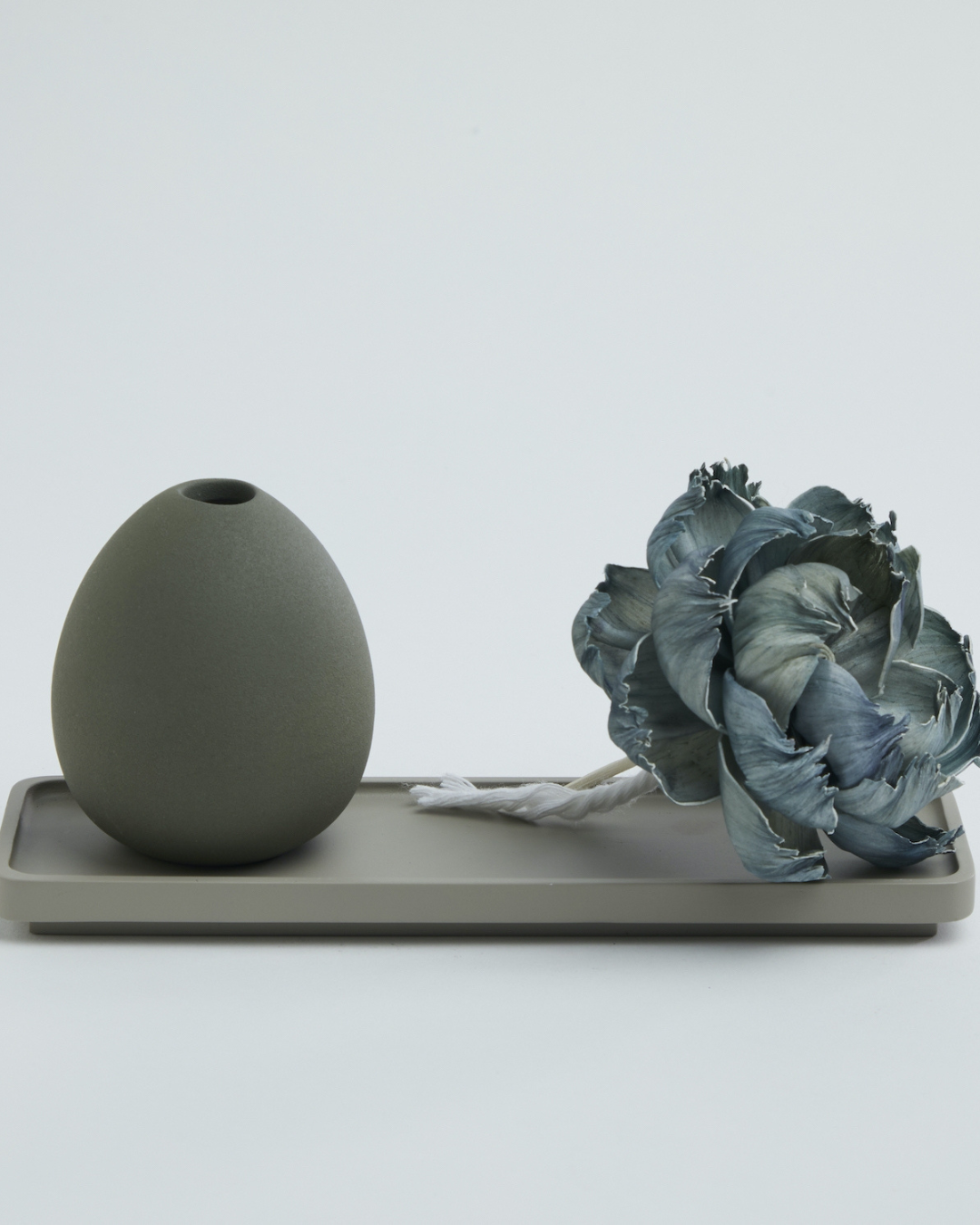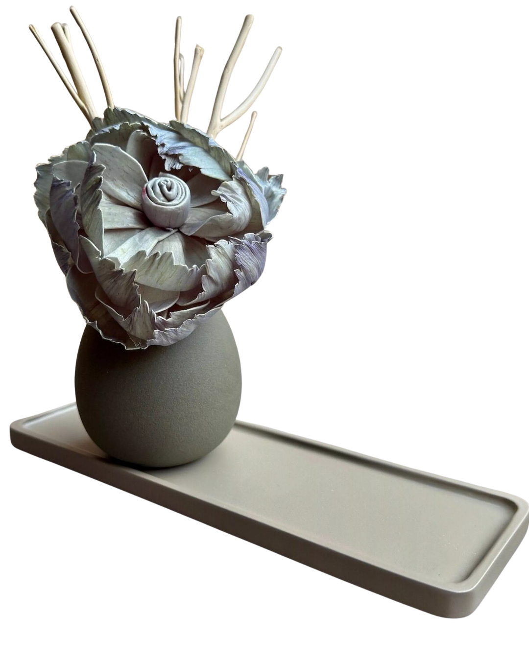 This set consists of a rectangular tray made of lacquered wood in a soft and timeless greige shade, ideal for showcasing your favorite perfume. On the tray, an egg-shaped vase in verdigris ceramic holds a sola flower which delicately diffuses the scents of your choice. The capacity of approximately 50 ml allows you to enjoy a long-lasting and subtle diffusion (fragrance not supplied). Composition: Lacquered wood tray, ceramic vase, sola flower. Colors: Beige (tray), Verdigris (vase), blue-green for the Sola flower Capacity: Approximately 50 ml. Fragrance: Not included – compatible with any fragrance for reed or flower diffusers. Presentation: Delivered in a printed cardboard box, ready to give as a gift. Perfect as a scented decorative object, a refined gift or an ambient element for a living room, bedroom or wellness area, the LEONI diffuser combines aesthetics and the art of living. Dimensions Length 30 cm Width 20 cm Height 10 cm Weight 500 g Composition wooden tray, ceramic vase, Sola flower Materials wood ceramic Sola