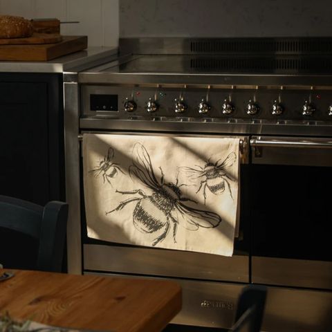 A beautifully simple, natural linen tea towel, hand screen printed with a stunning trio of bees design. Natural linen makes the most beautiful tea towels and this bee design will add a simple sophistication to your kitchen.. Woven in Scotland using traditional techniques in the last remaining linen mill in Scotland. Keeping the long history of linen production in Scotland alive, the mill has been perfecting their craft on the same site since 1825. Material: 50% Scottish Linen 50% Cotton. Dimensions: 50 x 140cm Product care: All pure cottons and linens shrink marginally after the first wash, the print shall also fade. This can be minimised by pre-washing in cold water, thereafter, dry flat and iron on reverse when damp. Wash with similar colours at 30 degrees. Slow spin. Do not tumble dry, bleach or dry clean. Sustainable - linen is made from flax, a renewable resource. Linen has many other important properties - it is immensely strong and durable, has antibacterial properties and wicks moisture so it dries faster than cotton aloneBelly band packagingWoven in Scotland Screen Printed