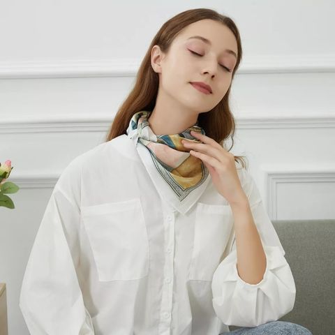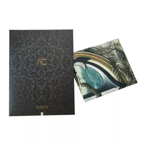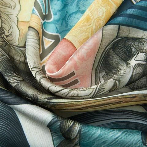 The "Anchoring of Dreams" scarf by Alberto Cabale captures the essence of adventure and discovery. At the heart of this design, a majestic anchor intertwined with sturdy ropes stands out against a background depicting an elegant ship sailing through turbulent waters. Framed with delicate floral motifs and classic nautical patterns in subtle hues of blue, cream and gold, this scarf embodies the spirit of legendary sea voyages. Crafted from pure silk, this 60x60cm square combines an artistic aesthetic with a luxurious finish