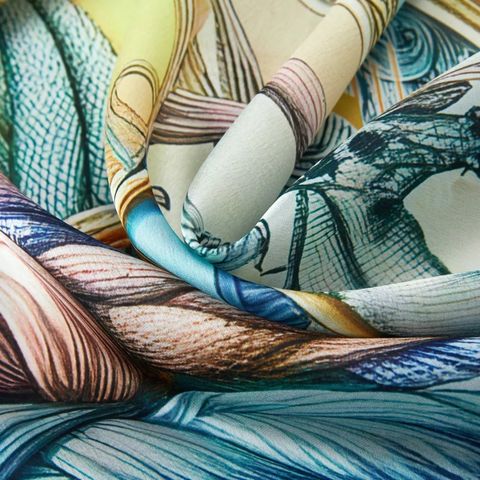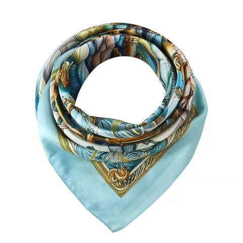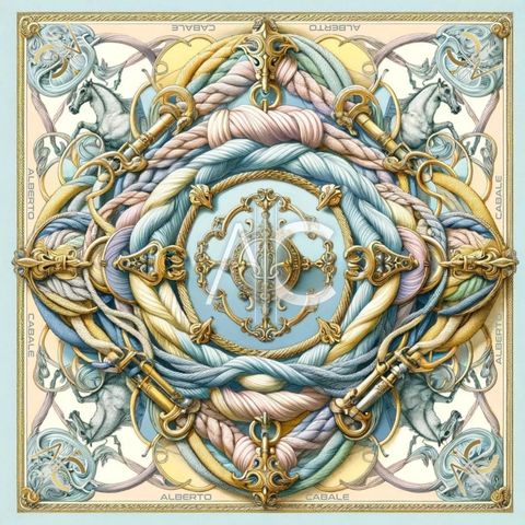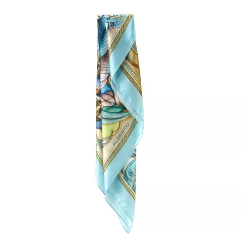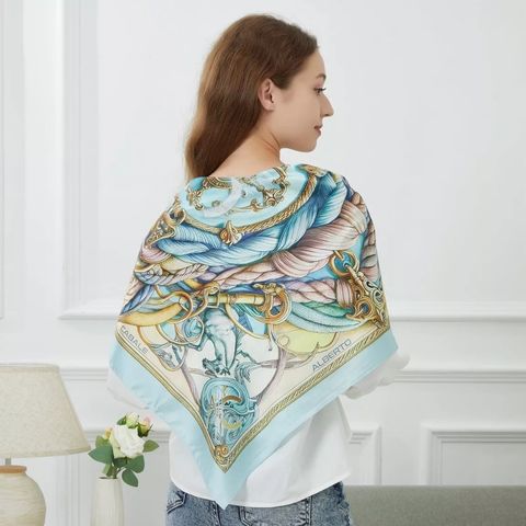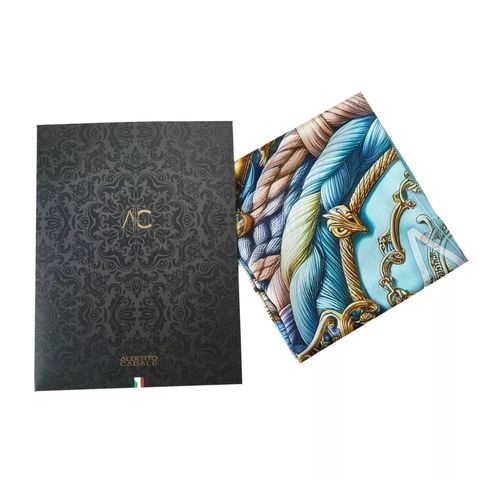 The "Spring Rope" scarf from the Zoé collection by Alberto Cabale embodies an exquisite fusion of baroque style and spring motifs. Made from 100% silk, this large 90x90cm square features a composition rich in ornamental details intertwined with floral and marine elements in soft pastel tones. The patterns of golden ropes and delicate flowers create a captivating and elegant visual effect, making this scarf a must-have to enhance an outfit with sophistication. Summary: Size: 90x90 cm Material: 100% silk Pattern: Ornamental patterns, ropes, and marine elements intertwined with flowers Predominant Color: Pastel blue, gold, and touches of pink Gift Box: Presented in our luxurious gift box, the "Spring Rope" scarf is ready to be given as a gift, perfect for those who cherish refined accessories and elaborate artistic designs.Size of the square fashion scarf