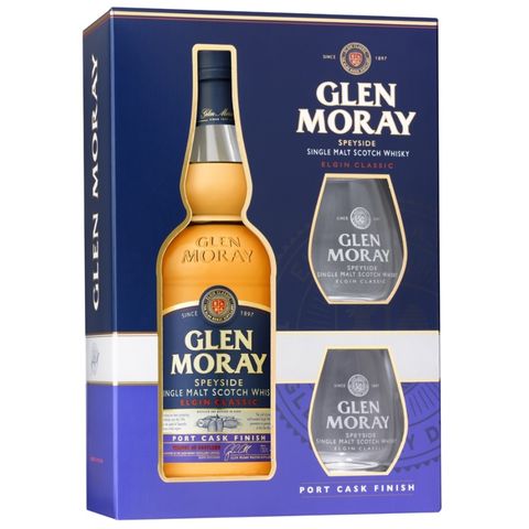 This exceptional set not only includes the renowned Glen Moray Port Cask Finish but also features two exquisite glasses, making it the perfect choice for aficionados and those just beginning their whisky journey.