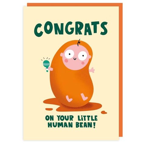 This funny new baby card features a baby dressed as a baked bean, complete with a rattle and bean juice! It's cute and quirky, perfect for celebrating new human beans and new families.
