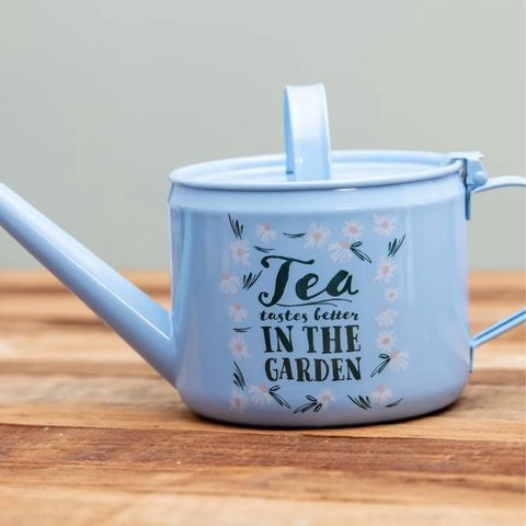 Take a moment to water your teacup with this gorgeous tin 'In the Garden' Watering Can Teapot! This fun unique watering can-shaped tin teapot is the perfect home accessory for people who love gardening! Complete with dainty blue floral decals and fun text that reads 'Tea Tastes Better in the Garden',