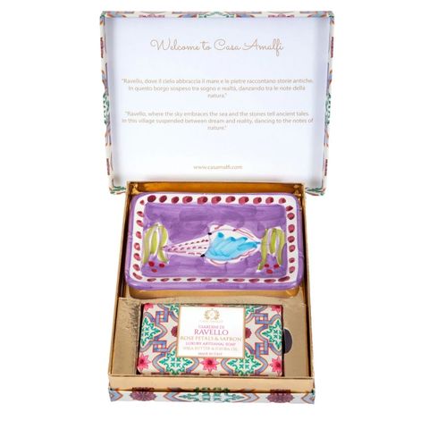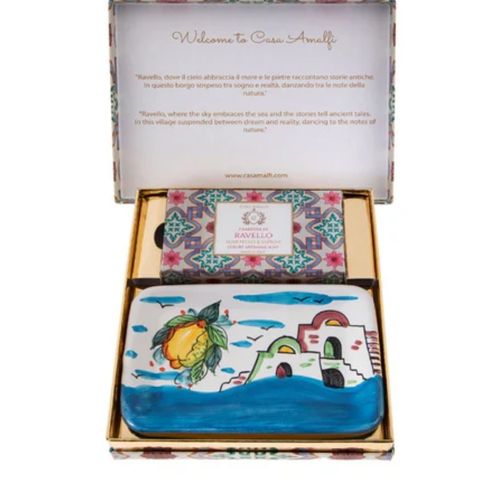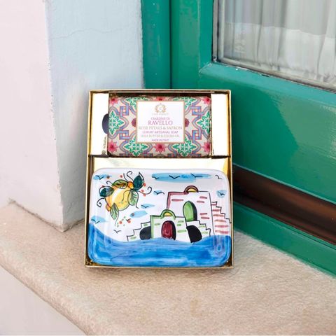 Celebrate the beauty of Ravello with this exquisite gift set. It features a hand-painted ceramic soap dish from the Amalfi Coast, complemented by our newly reformulated Giardini Di Ravello Body Soap—Triple Milled and made with 100% Italian olive oil. Inspired by the stunning gardens of Villa Rufolo, this soap is enriched with rose petals, saffron, and shea butter, offering a luxurious and relaxing experience.